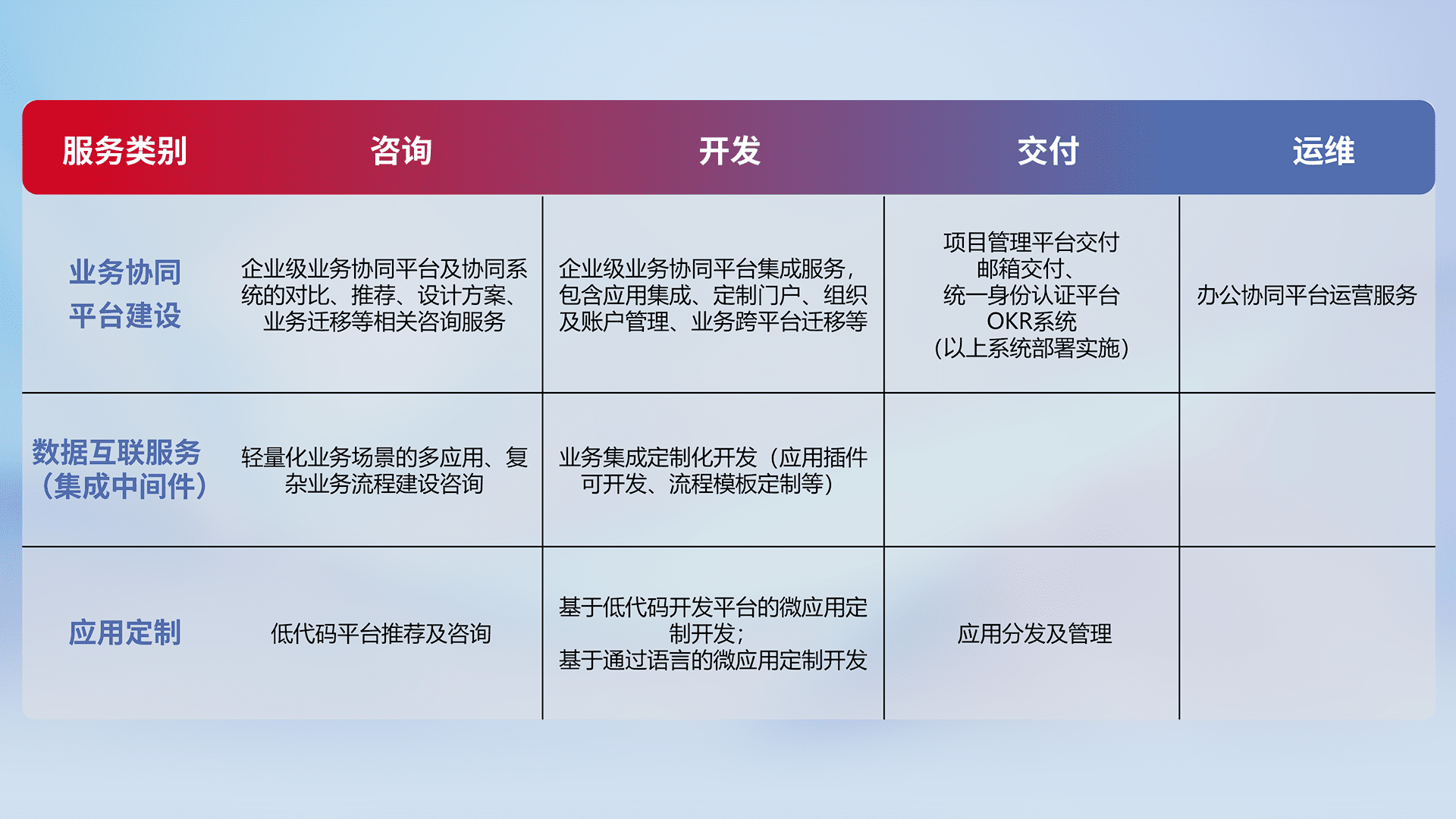 针对钉钉、、企微、、、、IDaas等平台级产品提供产品的规划、、方案、、、交付、、、定制化开发等服务,,实现如统一协同办公、、、智能客户服务、、、混合会议管理、、、智能数据查询、、等业务场景,,,,实现数字化转型。。