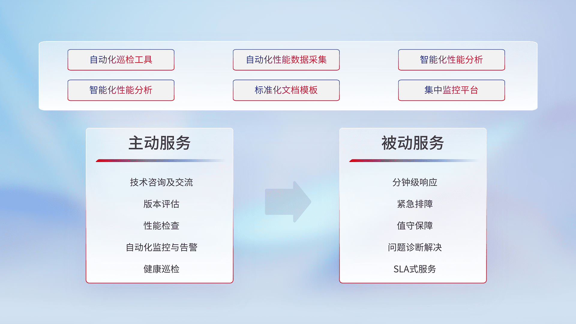 智能化工具和标准化文档,,,保障服务质量,,提供主动服务(包含技术咨询、、、版本评估、、、性能检查、、自动化监控与告警、、健康巡检)和被动服务包含(分钟级响应、、、、紧急排障、、、、值守保障、、问题诊断解决、、、SLA服务)。。。